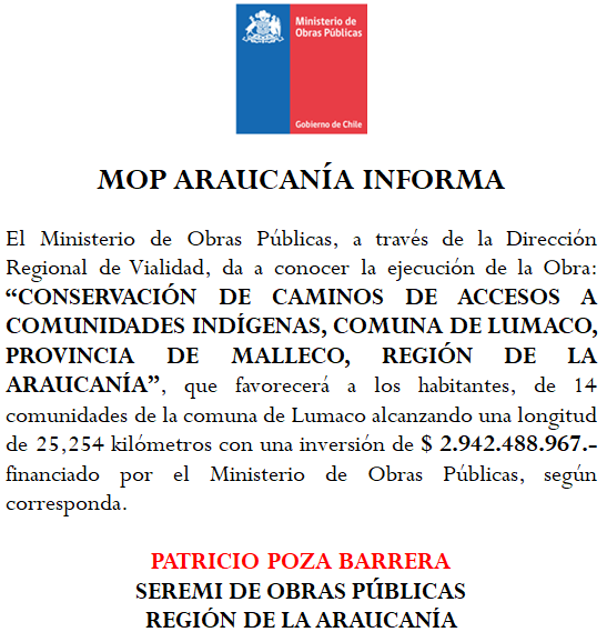 El Ministerio de Obras Públicas, a través de la Dirección Regional de Vialidad, da a conocer la ejecución de la Obra: “CONSERVACIÓN DE CAMINOS DE ACCESOS A COMUNIDADES INDÍGENAS, COMUNA DE LUMACO, PROVINCIA DE MALLECO, REGIÓN DE LA ARAUCANÍA”, que favorecerá a los habitantes, de 14 comunidades de la comuna de Lumaco alcanzando una longitud de 25,254 kilómetros con una inversión de $ 2.942.488.967.- financiado por el Ministerio de Obras Públicas, según corresponda.
